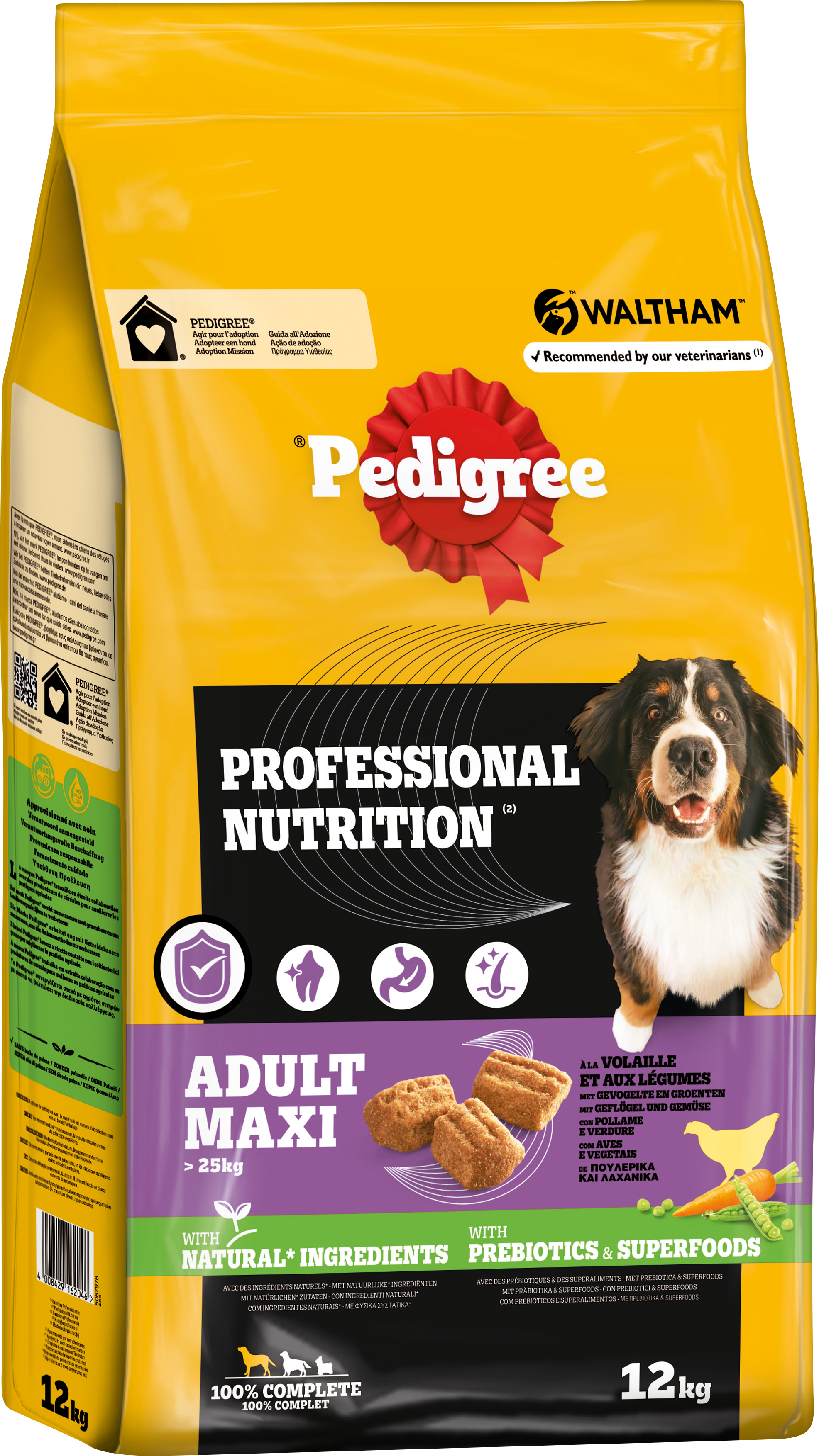 PEDIGREE® Adult Professional Nutrition ponúka dospelým psom vyváženú stravu s vysokokvalitnými zložkami, ako sú mäso, zelenina a celozrnné obilniny. Suché krmivo je vyrobené bez umelých farbív a dochucovadiel a poskytuje dôležité živiny pre aktívny život psa.