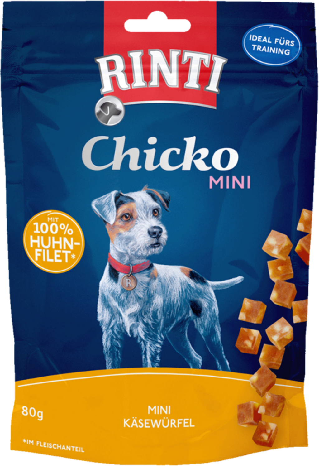 Chicko Mini syrové kocky od značky Rinti sú ideálnou odmenou pre dospelých psov. Sú vyrobené z kuracích pŕs a kúskov syra, sú šetrne a starostlivo sušené vzduchom a neobsahujú pridaný cukor, mäsové múčky ani sóju.