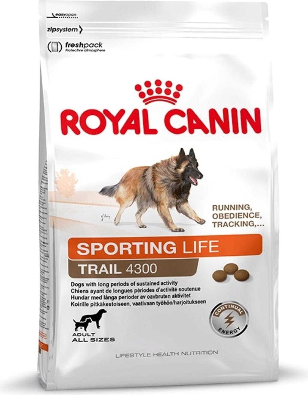 Energy 4300 Trail od spoločnosti ROYAL CANIN je špeciálne kompletné krmivo pre dospelých psov, ktorí sa venujú dlhodobej a intenzívnej fyzickej aktivite.