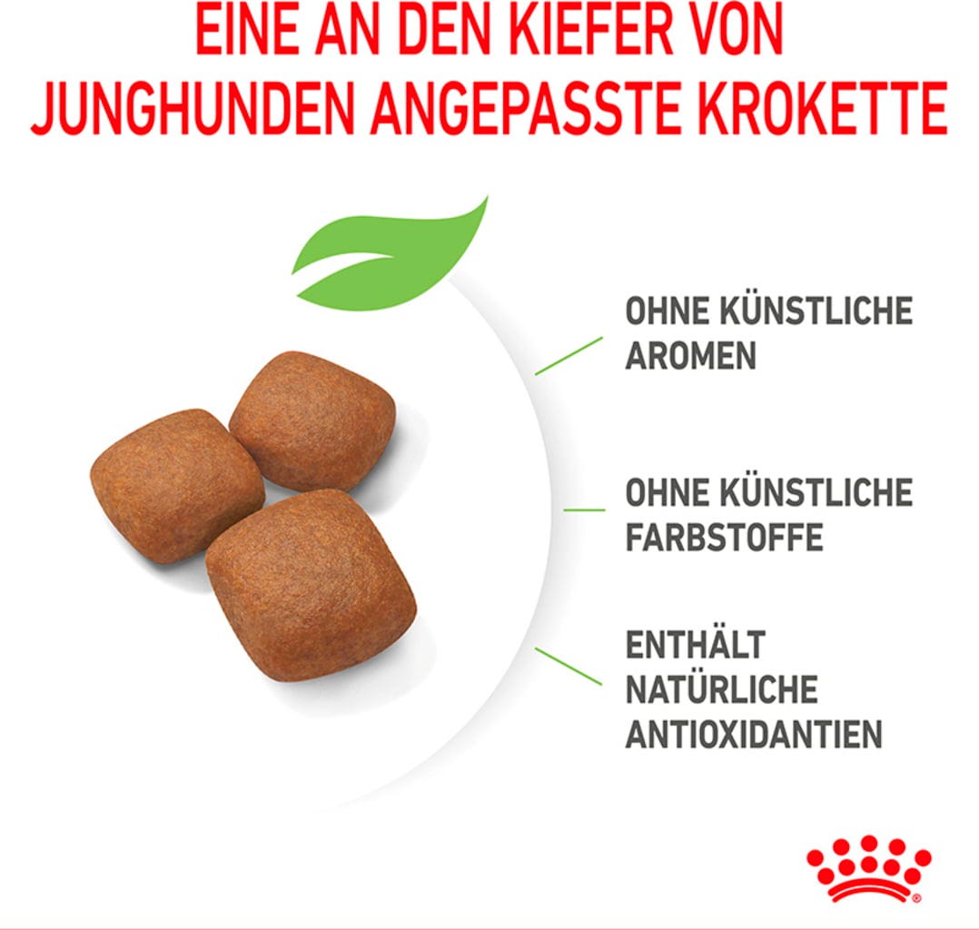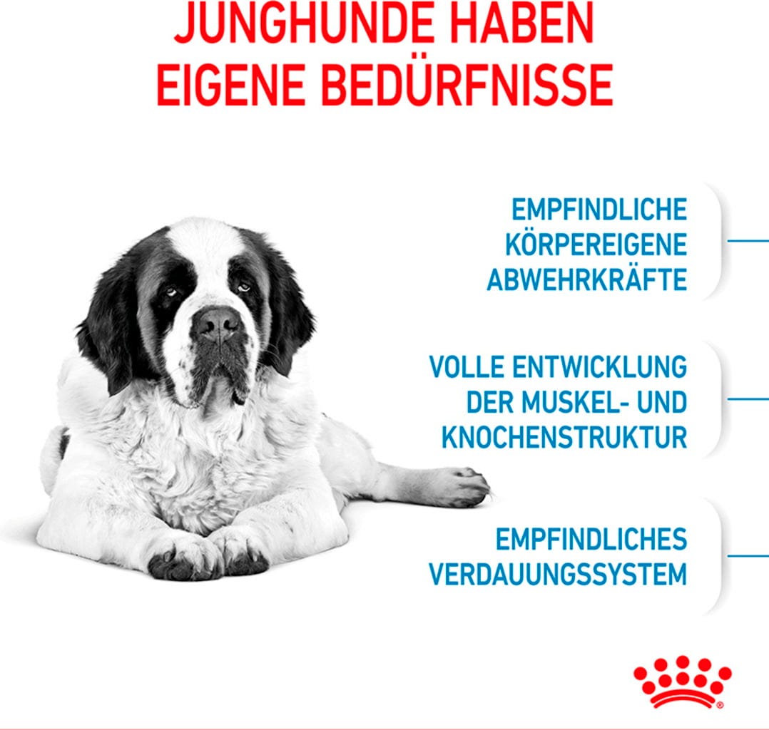 Bolo vedecky dokázané, že toto chutné krmivo podporuje vývoj vlastnej obranyschopnosti organizmu šteniat vďaka komplexu živín s vitamínmi E a C. Keďže šteniatko veľmi veľkého plemena si v druhej rastovej fáze od 8. do 18./24. mesiaca vytvára viac svalovej hmoty, rozvoj svalov možno podporiť prispôsobeným obsahom bielkovín. Kombinácia prebiotík (MOS) a vysoko stráviteľných bielkovín navyše podporuje vyváženú črevnú flóru a zdravé trávenie.