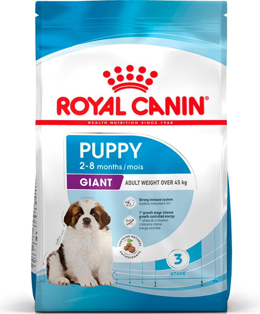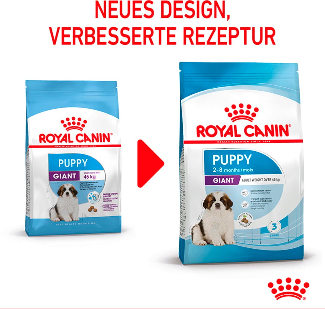 Počas fázy rastu sa šteňatá stretávajú s novými ľuďmi, objavujú nové veci a predovšetkým sa fyzicky menia. Postupne sa vyvíja aj ich prirodzená obranyschopnosť, čo znamená, že potrebujú podporu prostredníctvom vhodnej výživy. Krmivo ROYAL CANIN Giant Puppy je vhodné pre šteňatá obrovských plemien vo veku 2 až 8 mesiacov, ktoré v dospelosti dosahujú priemernú hmotnosť 45 kg a viac.