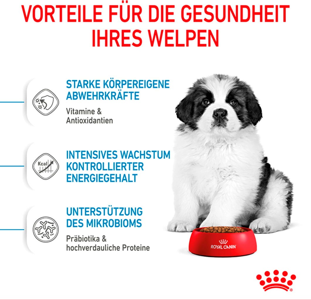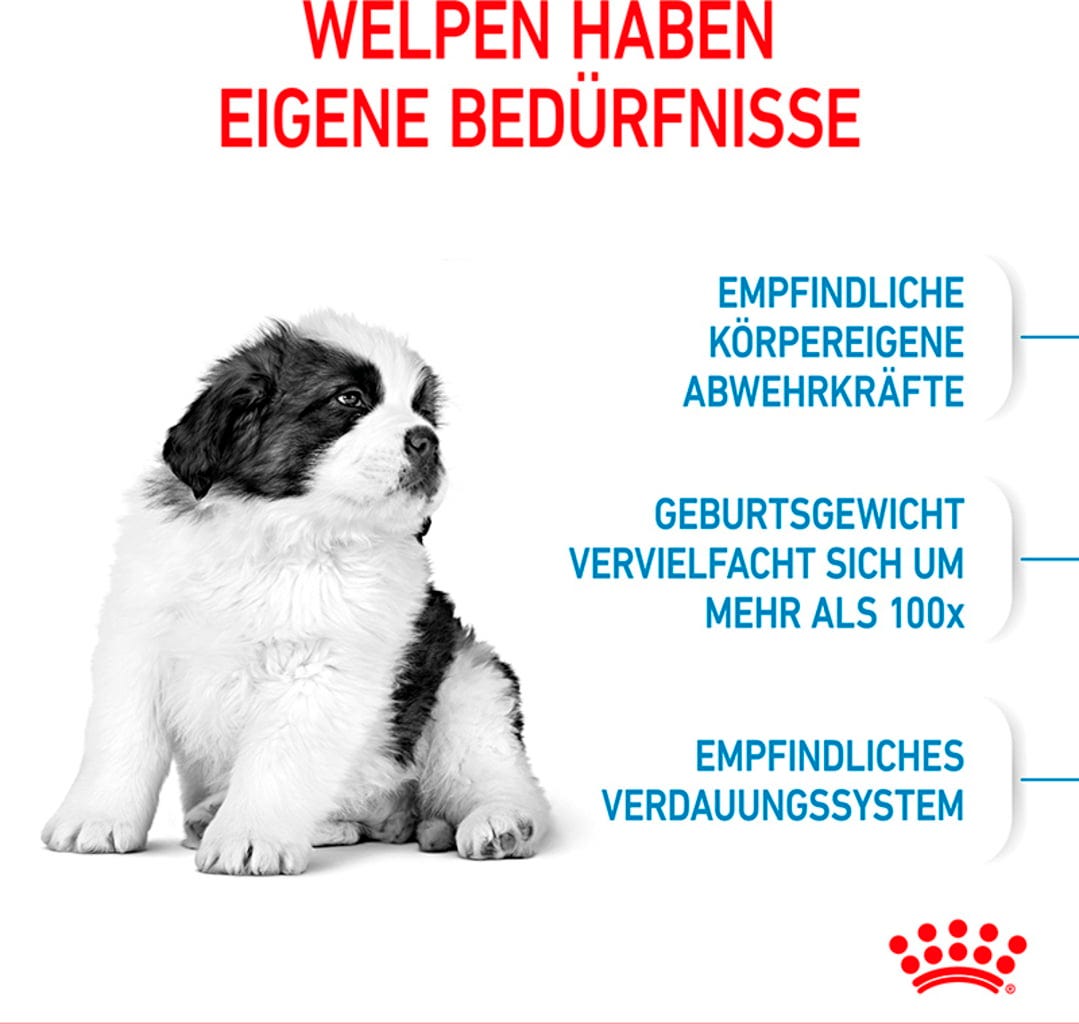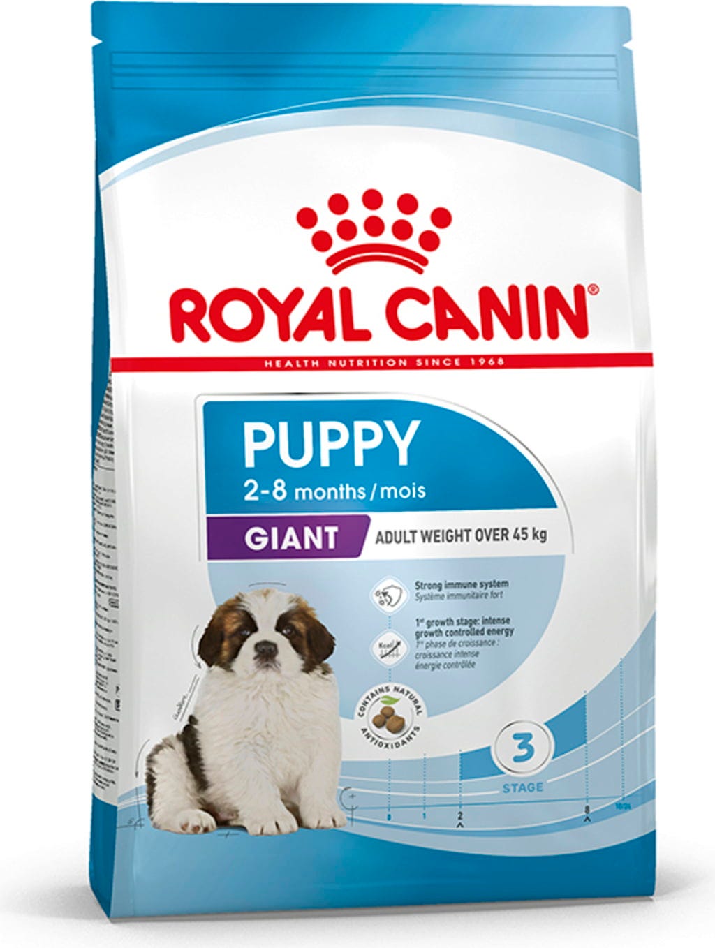 Počas fázy rastu sa šteňatá stretávajú s novými ľuďmi, objavujú nové veci a predovšetkým sa fyzicky menia. Postupne sa vyvíja aj ich prirodzená obranyschopnosť, čo znamená, že potrebujú podporu prostredníctvom vhodnej výživy. Krmivo ROYAL CANIN Giant Puppy je vhodné pre šteňatá obrovských plemien vo veku 2 až 8 mesiacov, ktoré v dospelosti dosahujú priemernú hmotnosť 45 kg a viac.