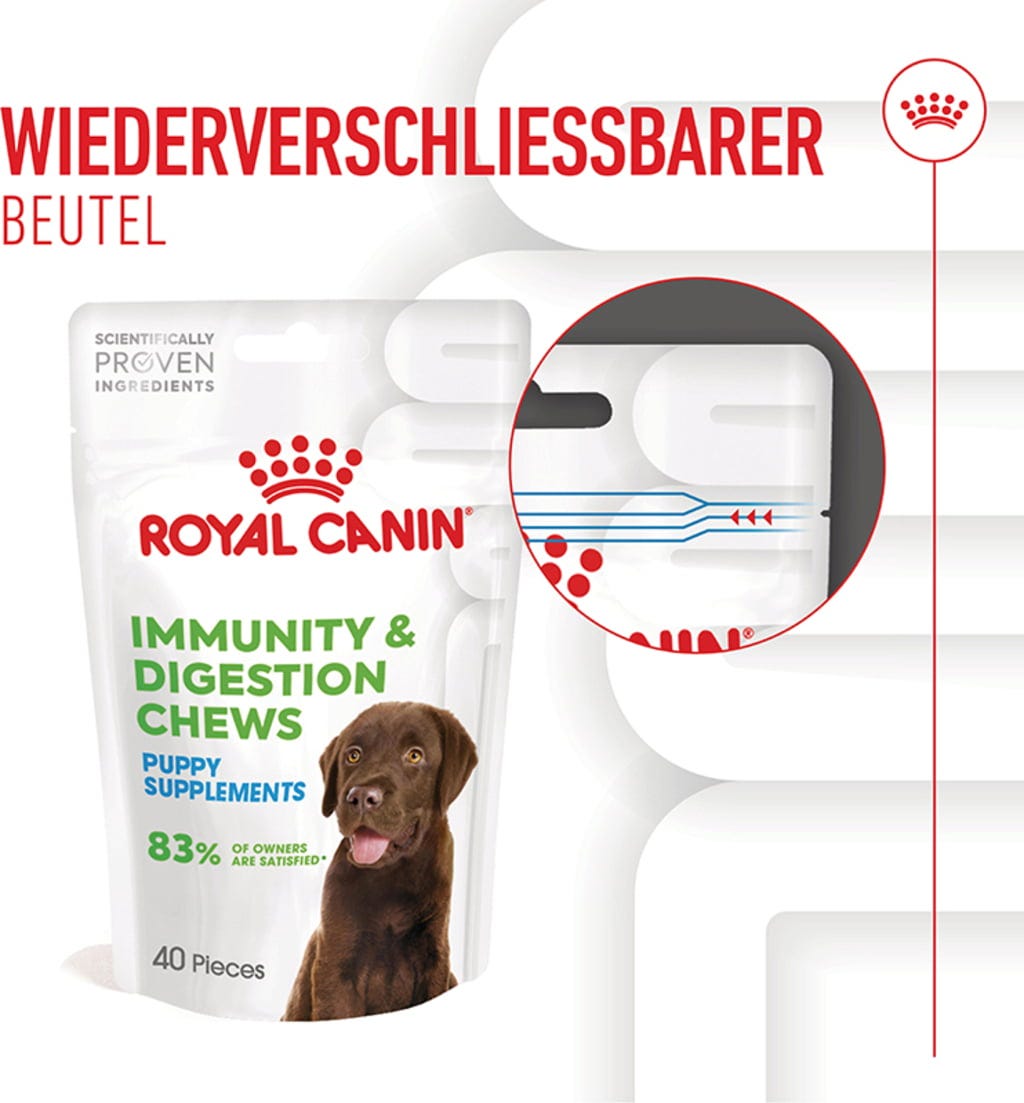 Royal Canin Puppy Immunity & Digestion Supplement Chews sú vhodné pre šteňatá od 6 mesiacov a sú ideálne ako každodenný doplnok ku kompletnému krmivu.