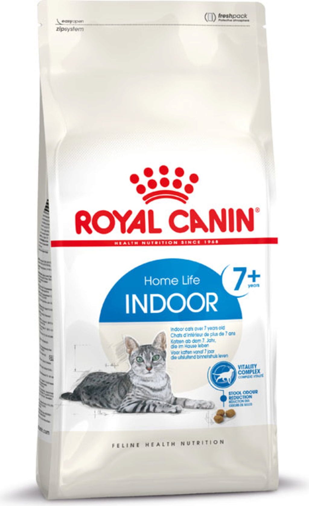 Dospelé mačky, ktoré žijú prevažne vo vnútri, potrebujú vyvážené kompletné krmivo na zabezpečenie optimálneho zdravia hneď, ako sa objavia prvé príznaky starnutia. Krmivo ROYAL CANIN Indoor 7+ je vhodné pre mačky od 7 rokov a bolo špeciálne vyvinuté tak, aby spĺňalo nutričné potreby dospelých mačiek, ktoré žijú prevažne v interiéri.