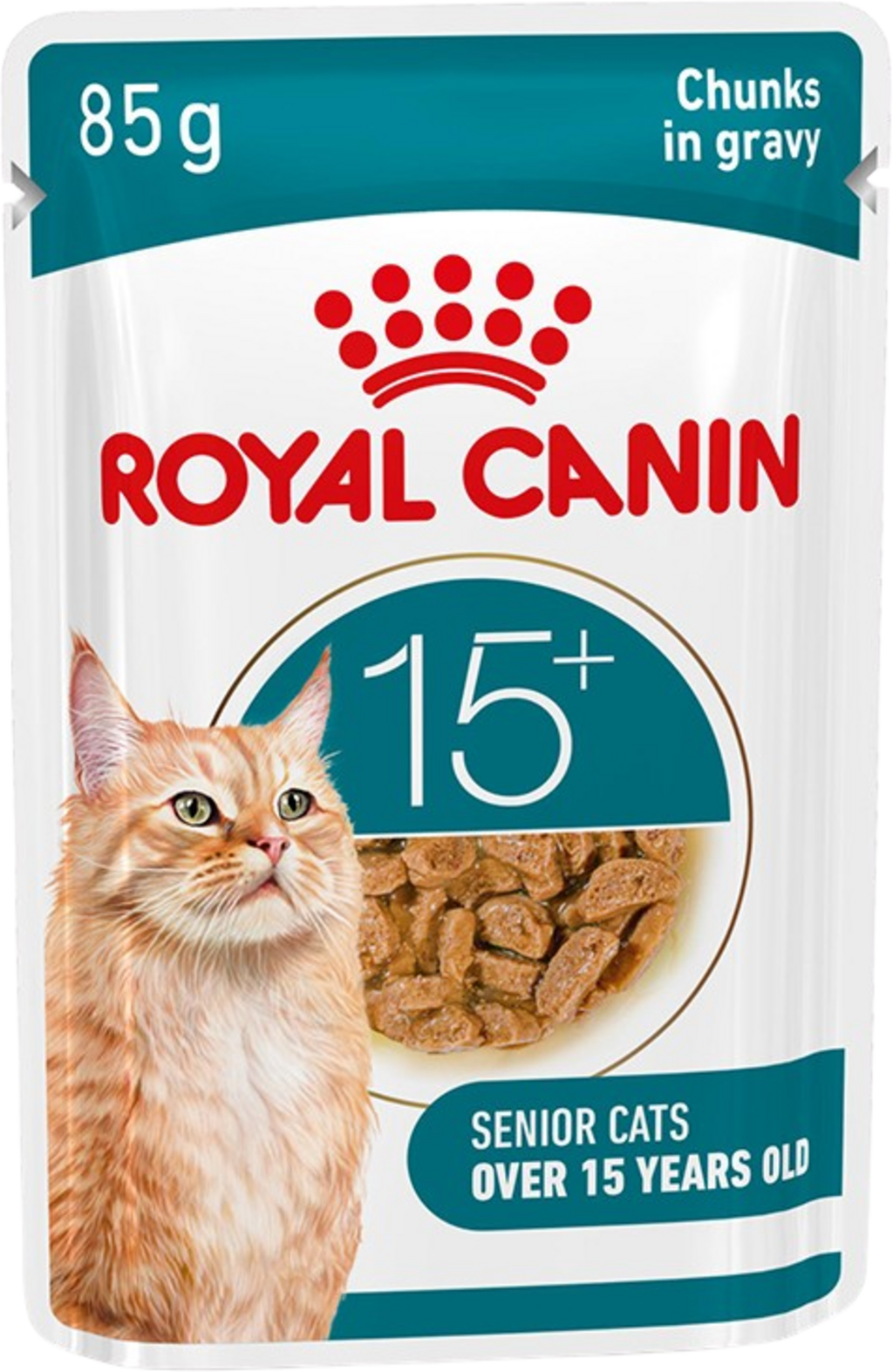 ROYAL CANIN® AGEING 15+ v omáčke je mokré krmivo pre mačky vo veku 15 rokov a viac. Bolo vyvinuté pre staršie mačky a má ľahko žuvateľnú konzistenciu, ktorá vašej mačke poskytne príjemný zážitok z kŕmenia. Táto receptúra je zároveň veľmi chutná*