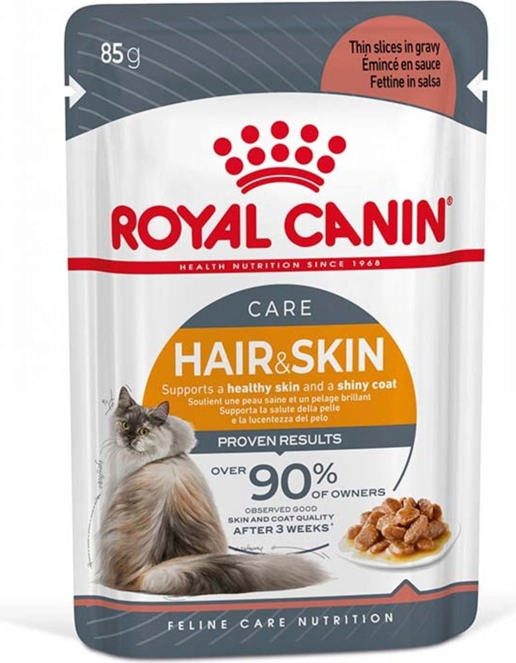 ROYAL CANIN® Hair & Skin Care je k dispozícii vo forme jemných kúskov v želé, pene alebo suchého krmiva. Zmes mokrého a suchého krmiva poskytuje rozmanitosť, ktorú mačky milujú. Zatiaľ čo suché krmivo má efekt čistenia zubov a ľahšie sa skladuje, obsah vlhkosti v mokrom krmive podporuje hydratáciu a zdravie močových ciest.