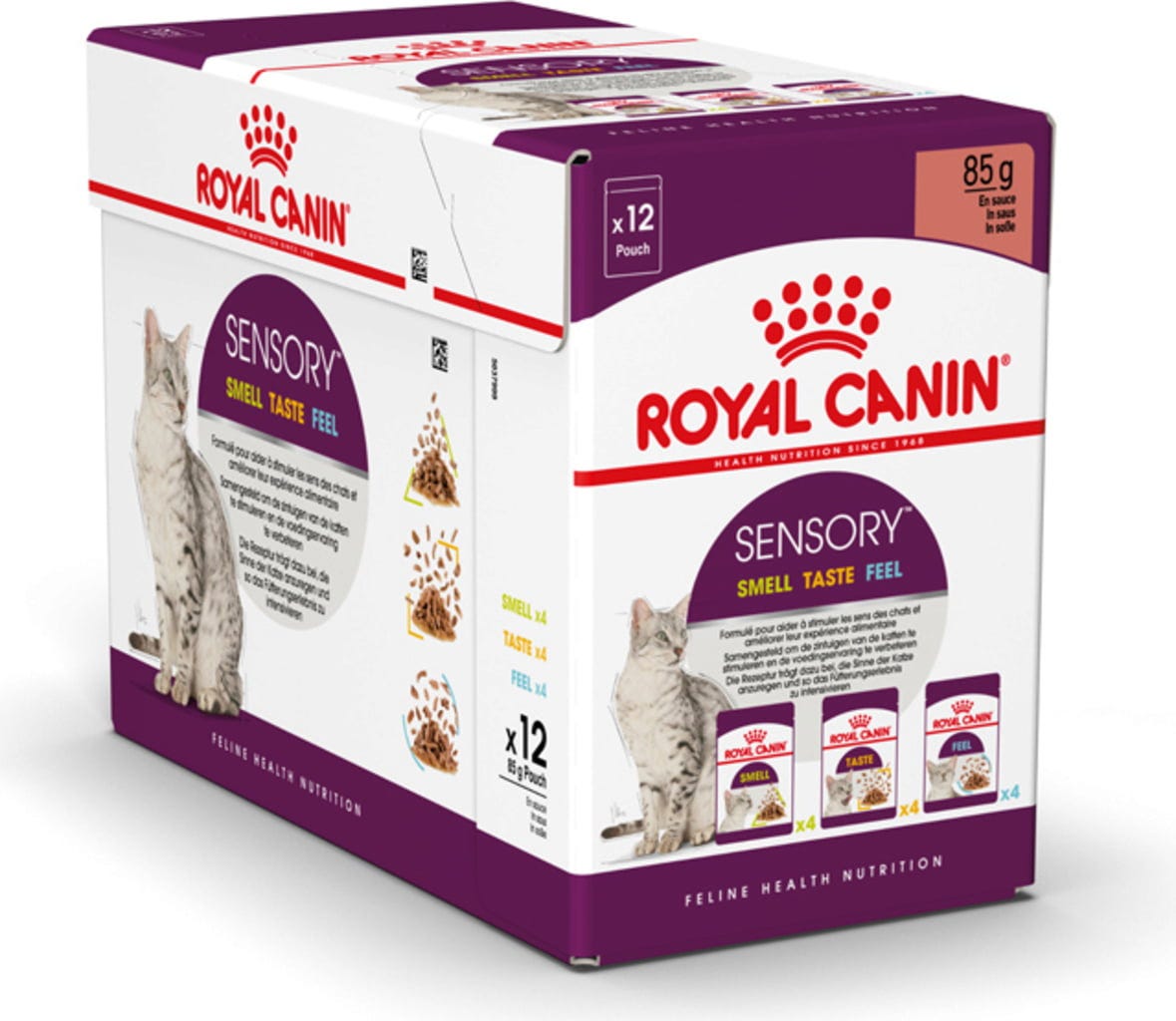 Vďaka jedinečnej povahe zmyslov vnímajú mačky svoje okolie veľmi špecifickým spôsobom. Ich blaho v konečnom dôsledku závisí okrem iného od toho, ako sú ich zmysly stimulované. Royal Canin vyvinul tri mokré krmivá so SENSORY™, pričom každé z nich je navrhnuté tak, aby stimulovalo čuch, chuť a pocit v ústach mačky, a tým poskytovalo zmyslovú rozmanitosť. Vďaka svojmu zloženiu s optimálnym profilom makroživín je SENSORY™ inštinktívne uprednostňované mačkami. Vyvážený obsah minerálov pomáha udržiavať zdravie močových ciest dospelých mačiek.