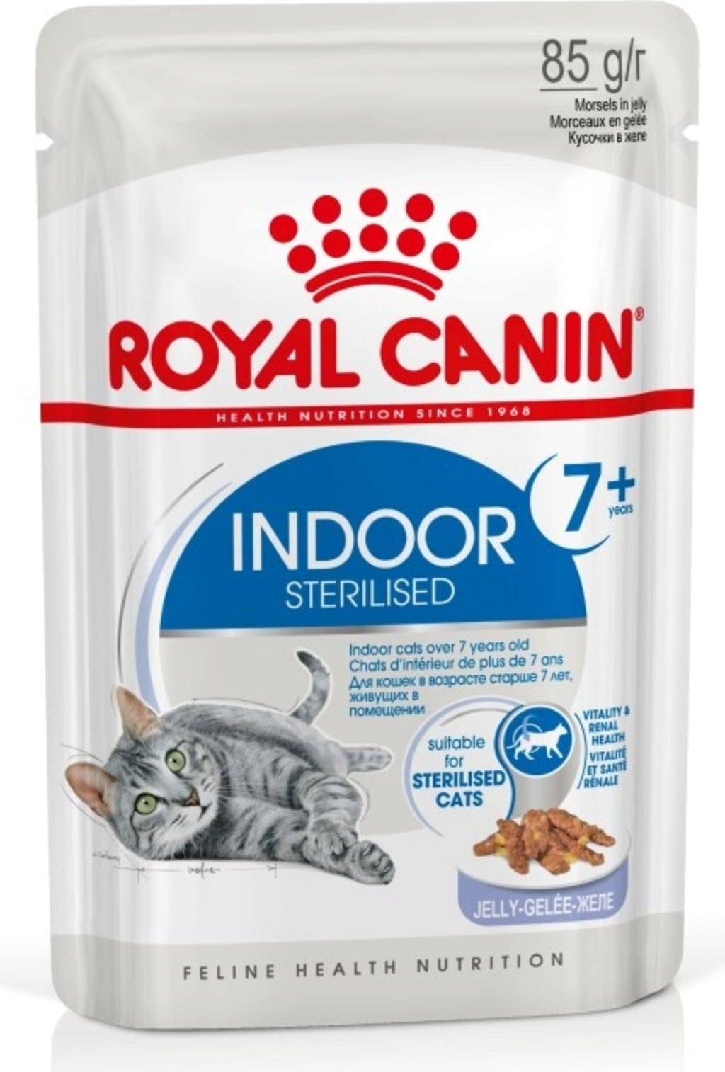 Aby sa vyhovelo individuálnym preferenciám každej mačky, je mokré krmivo ROYAL CANIN INDOOR 7+ k dispozícii vo forme kúskov v omáčke alebo želé.