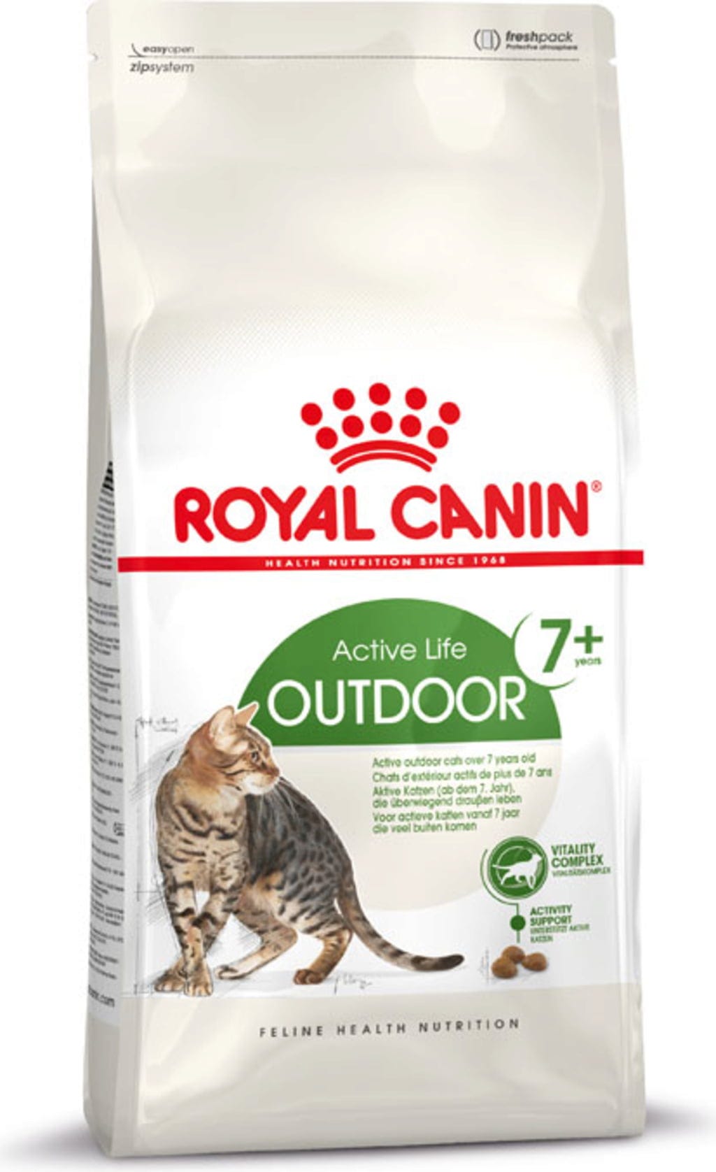 Krmivo ROYAL CANIN Outdoor 7+ je vhodné pre aktívne mačky žijúce vonku od 7 rokov a obsahuje exkluzívny komplex vitality, ktorý podporuje staršie mačky počas prvých príznakov starnutia.