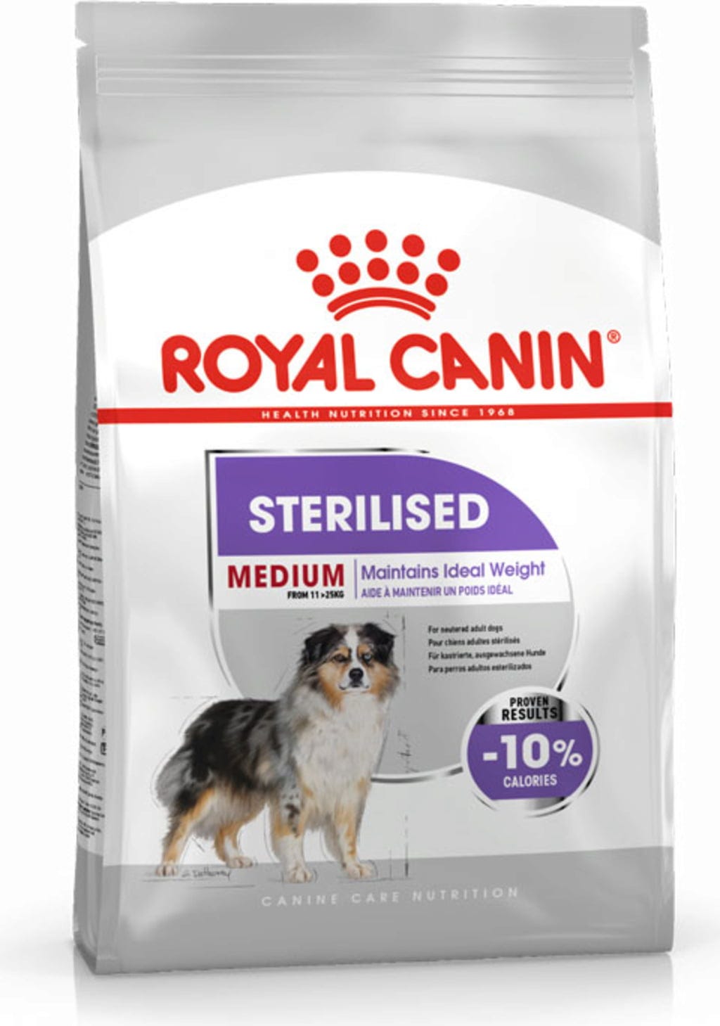 ROYAL CANIN® Sterilised Medium sa osvedčilo ako úspešné krmivo na prevenciu priberania: obsahuje o 10 % menej kalórií ako bežné krmivo pre dospelých psov.