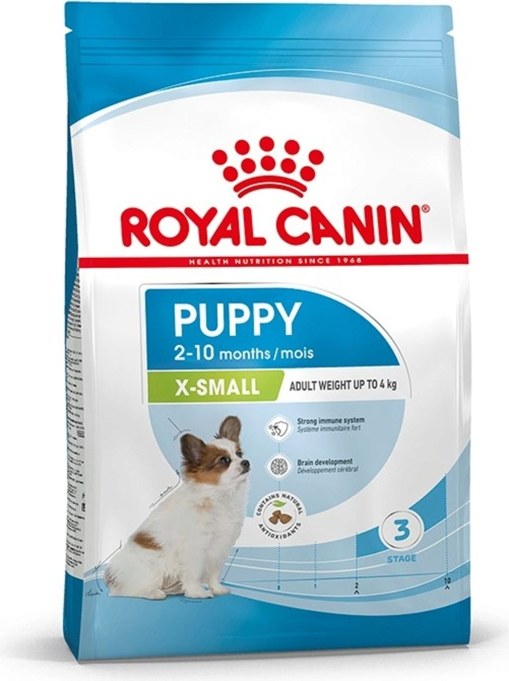 Krmivo ROYAL CANIN X-Small Puppy je špeciálne vyvinuté pre potreby šteniat veľmi malých plemien. Bolo vedecky dokázané, že podporuje vývoj obranyschopnosti organizmu šteniat prostredníctvom komplexu živín s vitamínmi E a C. Je tiež obohatené o omega-3 mastnú kyselinu (DHA), o ktorej bolo vedecky dokázané, že podporuje vývoj mozgu šteniat a môže podporiť proces učenia počas ranného výcviku šteniat. Kombinácia prebiotík (MOS) a vysoko stráviteľných bielkovín podporuje vyváženú črevnú flóru a zdravé trávenie.