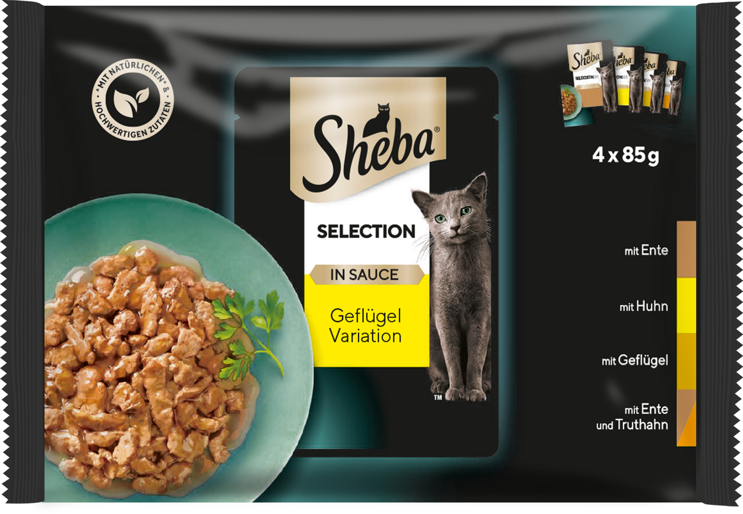 Šťavnaté kúsky mäsa v lahodnej omáčke potešia aj tú najnáročnejšiu mačku. Každý výber obsahuje štyri druhy, napr. výber hydiny - kuracie, morčacie, kačacie a miešané hydinové mäso. Jedno balenie obsahuje 4 kapsičky po 85 g - kompletné krmivo pre dospelé zvieratá.