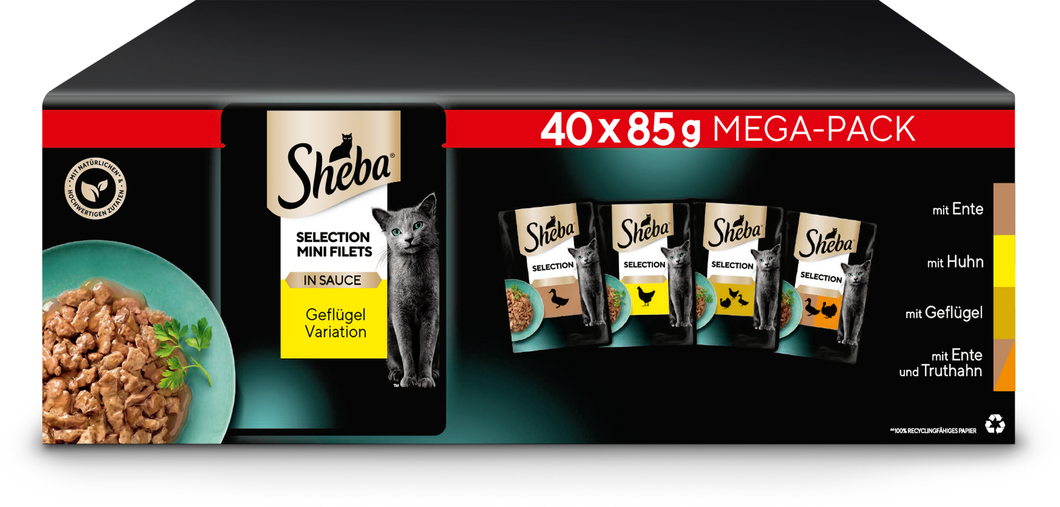 Šťavnaté kúsky mäsa v lahodnej omáčke potešia aj tú najnáročnejšiu mačku. Každý výber obsahuje štyri druhy, napr. výber hydiny - kuracie, morčacie, kačacie a miešané hydinové mäso. Jedno balenie obsahuje 40 porcií po 85 g - kompletné krmivo pre dospelé zvieratá.