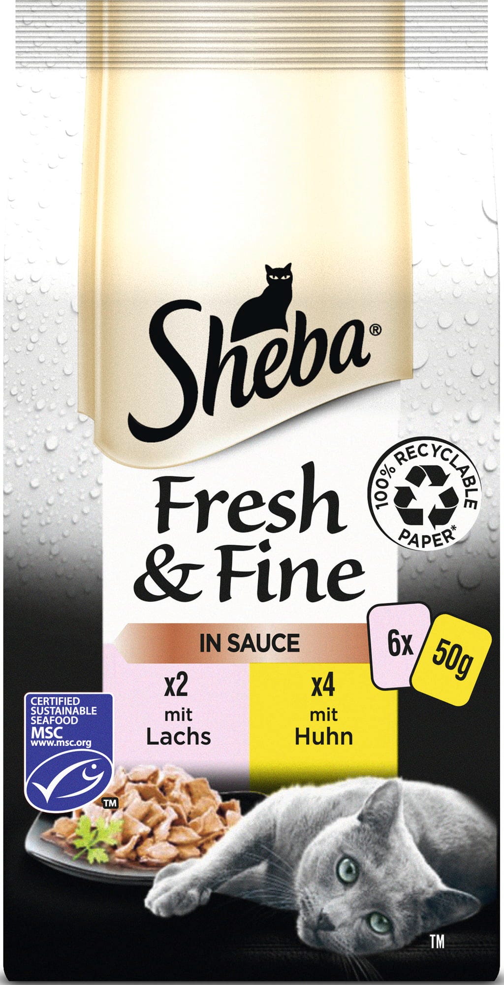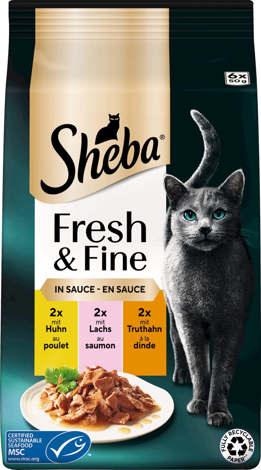 Sheba Kuracie mäso a losos (MSC) v omáčke Fresh & Fine 6 x 50 g, 300 g