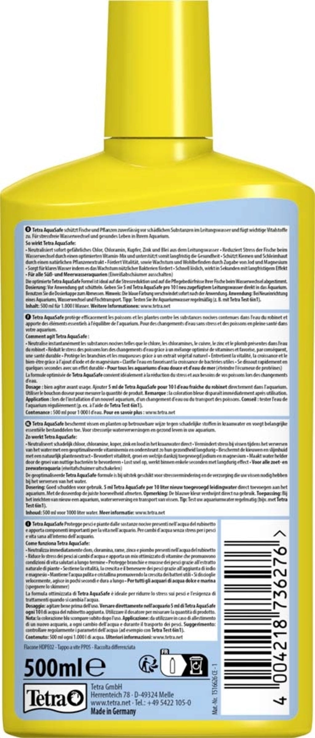 AquaSafe spoľahlivo chráni ryby a rastliny pred škodlivými látkami vo vode z vodovodu a dodáva dôležité životne dôležité látky pre prirodzenú akváriovú vodu. Optimalizované zloženie je ideálne prispôsobené potrebám starostlivosti o pokožku a plutvy vašich rýb. Kondicionér vody okamžite neutralizuje nebezpečný chlór, chloramín, meď, zinok a olovo. Žiabre a sliznice rýb sú chránené a vitamíny skupiny B znižujú stres. Tetra AquaSafe podporuje vitalitu, rast a pohodu pridaním jódu a horčíka a zabezpečuje čistú vodu tým, že podporuje rast prospešných baktérií.