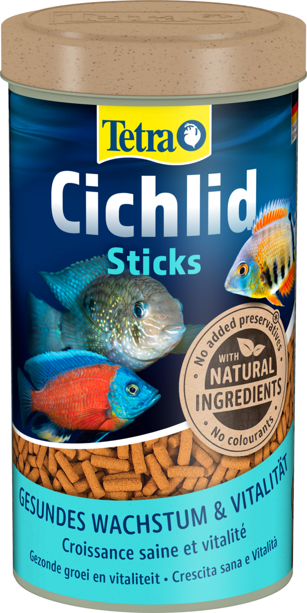 S Tetra Cichlid Sticks vyvinula spoločnosť Tetra základné krmivo pre vyváženú stravu všetkých cichlíd a iných veľkých okrasných rýb, ktoré majú zvýšenú potrebu živočíšnych bielkovín. Tyčinky plávajú na hladine a odpovedajú prirodzenému správaniu veľkých rýb pri kŕmení vďaka svojmu tvaru a veľkosti pripomínajúcej červy. Prírodná receptúra s vysokokvalitnou zmesou bielkovín a bez farbív a pridaných konzervačných látok podporuje normálny rast a zdravú odolnosť. Vysokú prijateľnosť a stráviteľnosť zabezpečuje čistá voda a vysoká kvalita vody.