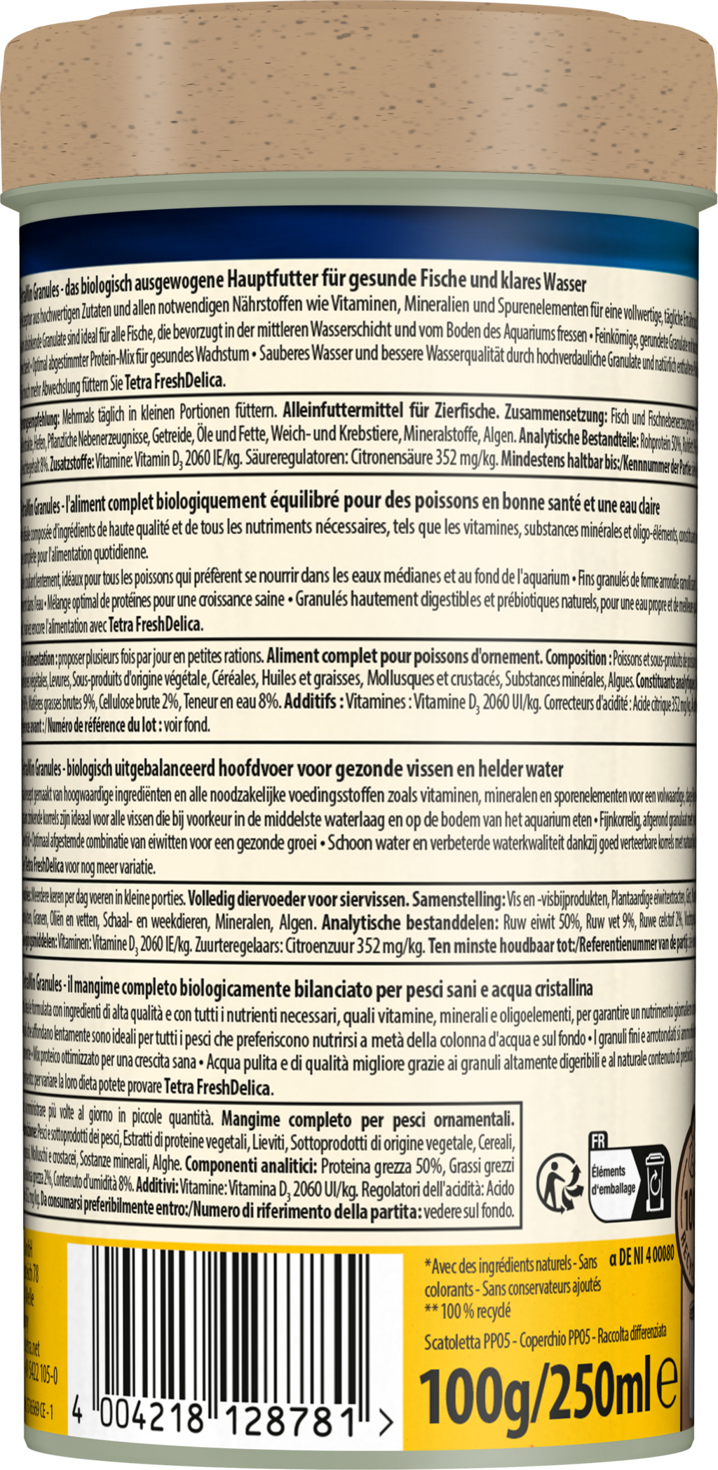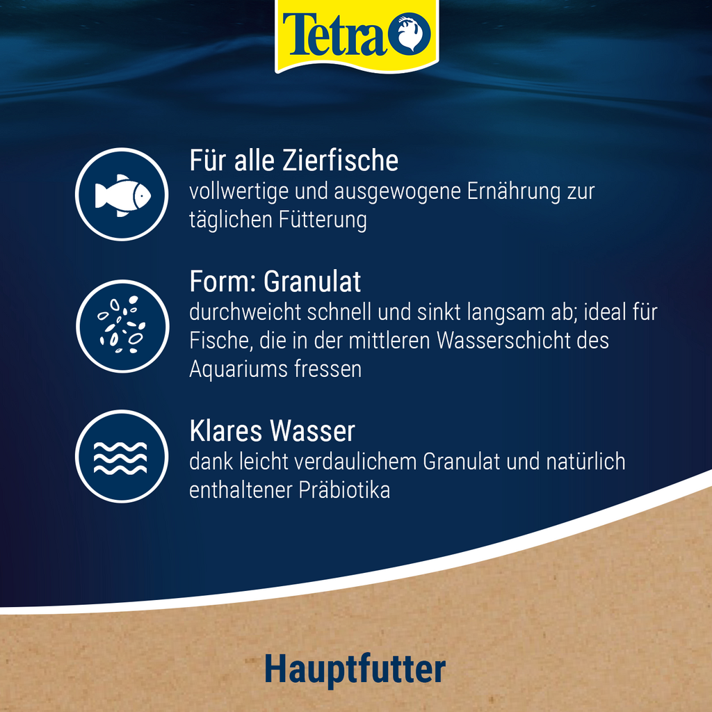 Predstavuje jemnozrnný granulát, ktorý je vhodný pre kompletnú a druhovo vhodnú výživu všetkých okrasných rýb. Má krátky čas nasiaknutia a pomaly a rovnomerne sa ponára, preto je ideálny pre ryby, ktoré sa živia v stredných vrstvách vody. Vysokokvalitné zloženie s prírodnými zložkami, BioActive receptúra a extra prebiotiká neobsahuje žiadne farbivá ani pridané konzervačné látky a podporuje vitálny život rýb a normálne fungujúci imunitný systém. Vysoká stráviteľnosť tiež zaisťuje, že voda v akváriu zostane dlho čistá.