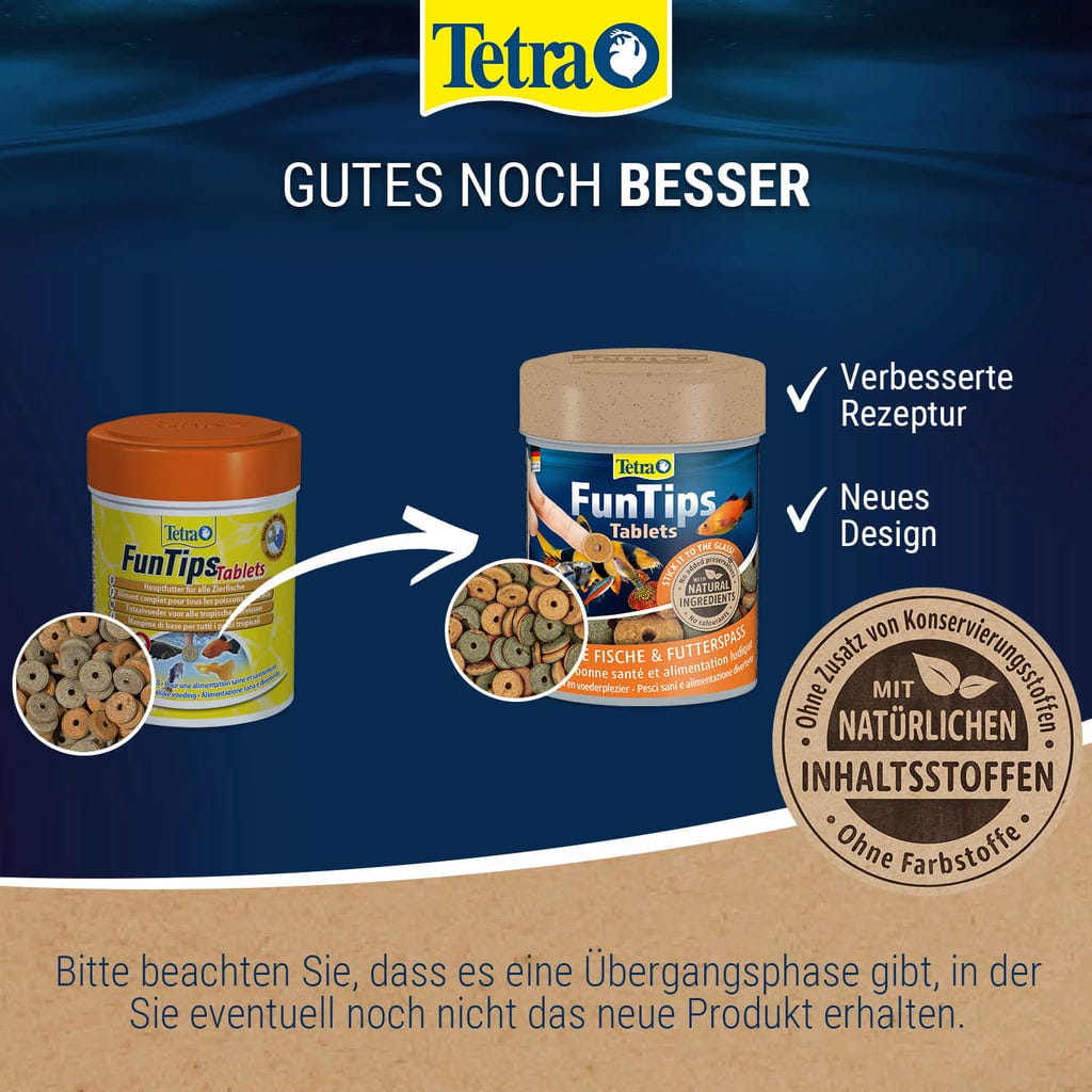Tablety FunTips sa prilepia na sklo akváriá a mierne sa zatlačia, aby optimálne držali. Podávajte len také množstvo krmiva, ktoré ryby dokážu skonzumovať približne za 1 hodinu. Dátum minimálnej trvanlivosti na obale označuje čas, do ktorého zostanú potraviny pri správnom skladovaní a uzavretí nezkazené. Ak chcete spestriť stravu vašich rýb, odporúčame kŕmiť ich 2-3-krát týždenne produktom FreshDelica značky Tetra.