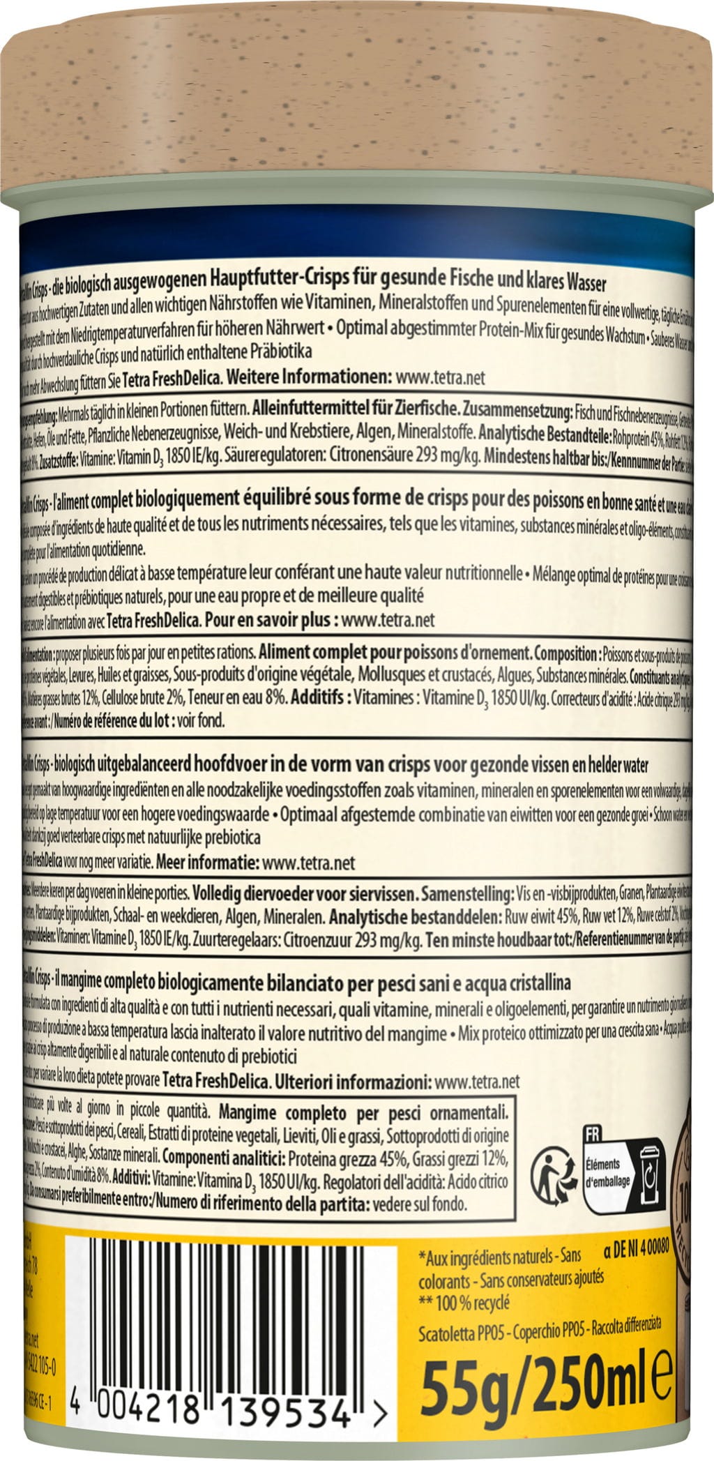 TetraMin Crisps je biologicky vyvážené základné krmivo pre všetky tropické okrasné ryby v sladkovodných akváriách, ktoré žijú vo všetkých vodných pásmach. Poskytuje druhovo vhodnú a plnohodnotnú stravu.