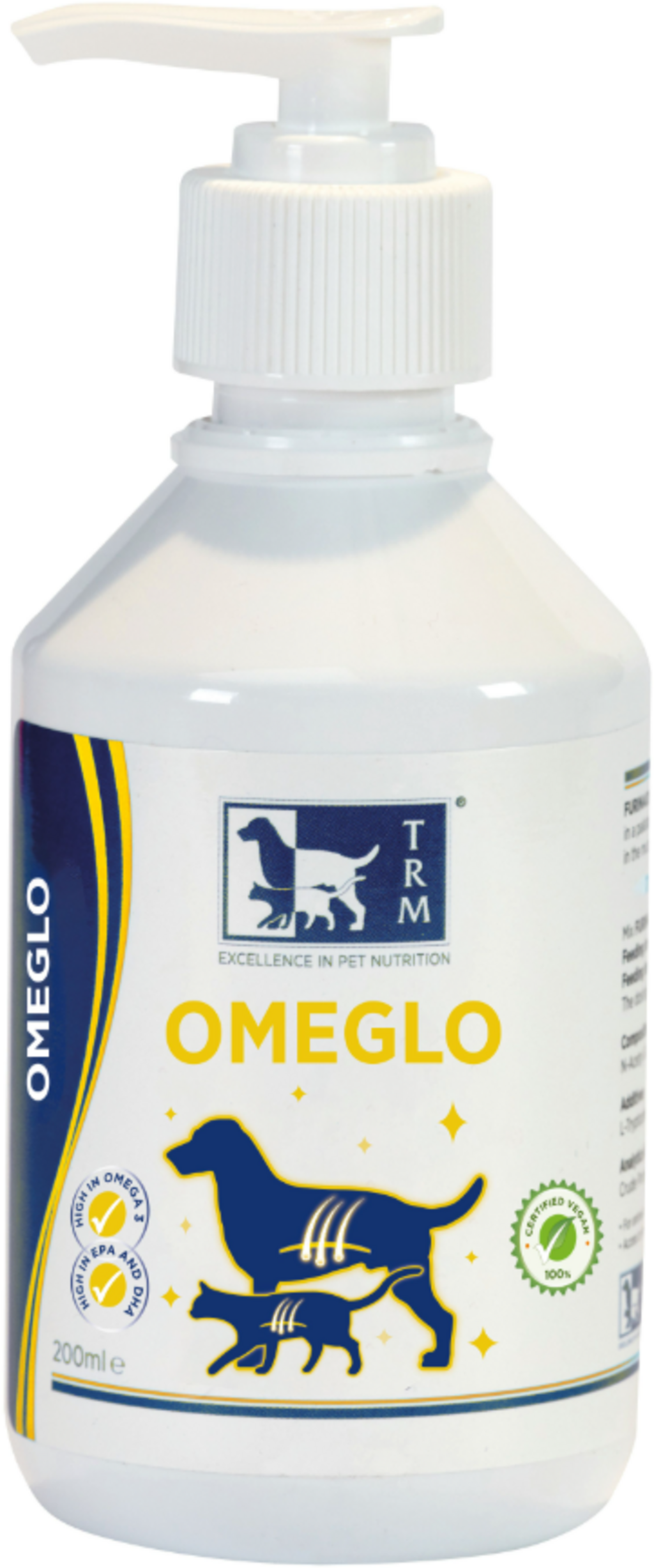 Omeglo od TRM je doplnok stravy pre psov a mačky, ktorý optimálne podporuje kožu a kĺby vášho domáceho maznáčika. Doplnok je obohatený o olej z morských rias a možno ho ľahko pridať do krmiva. Jedna pumpička dodáva 2 ml prípravku Omeglo.