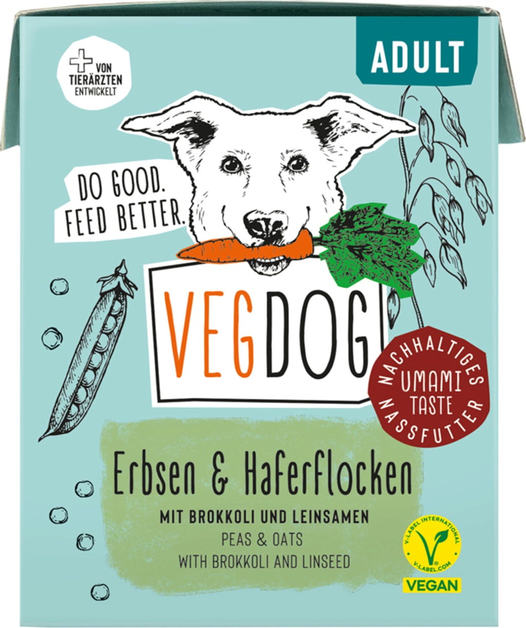 Toto Adult mokré krmivo v Tetra Paku od značky VEGDOG, nielenže mení svet obalov krmív pre psov, ale zoznamuje psov aj s novými chuťami! Vegánska receptúra kombinuje sýte ovsené vločky, proteín z hrachu a lupiny a poskytuje dôležité živiny, ktoré psy potrebujú od prvého roku života. Do špeciálnej zmesi boli pridané riasy a ľanové semienka, aby bolo krmivo obohatené o esenciálne omega-3 a omega-6 mastné kyseliny.