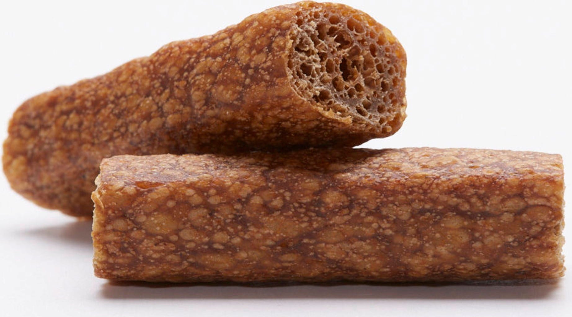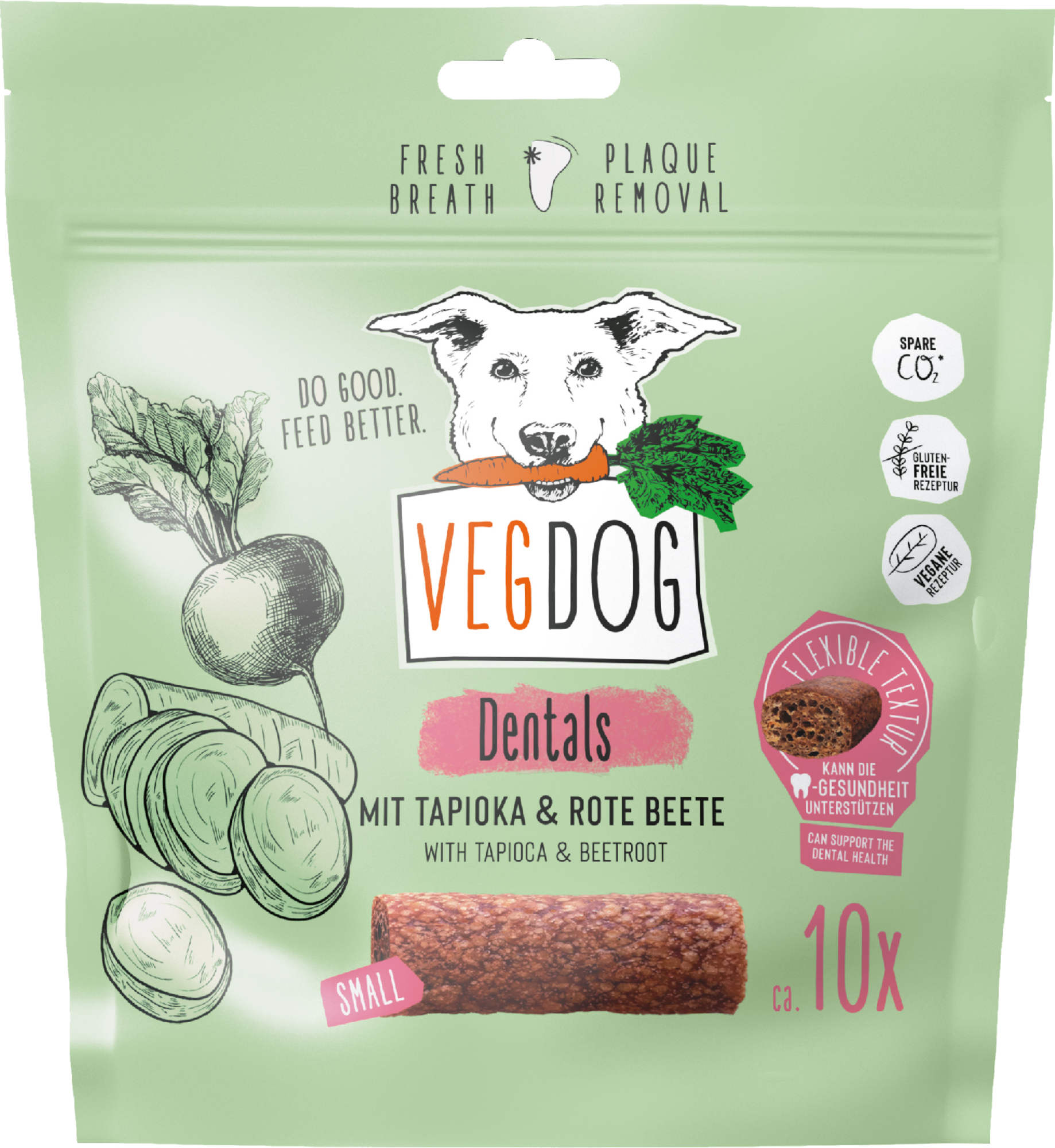 Vegánsky variant kosti od značky VEGDOG. Chutné snacky DENTALS so špongiovou štruktúrou ponúkajú neodolateľnú chuť červenej repy a obsahujú cenný vitamín C. Zatiaľ čo psy ocenia chuť a pevnosť snackov, majitelia môžu oceniť ich prínosy. Pri žuvaní dochádza k aktívnemu pohybu čeľustného svalstva psov, čo môže dlhodobo podporovať dentálnu hygienu. Jednoducho dentálne!