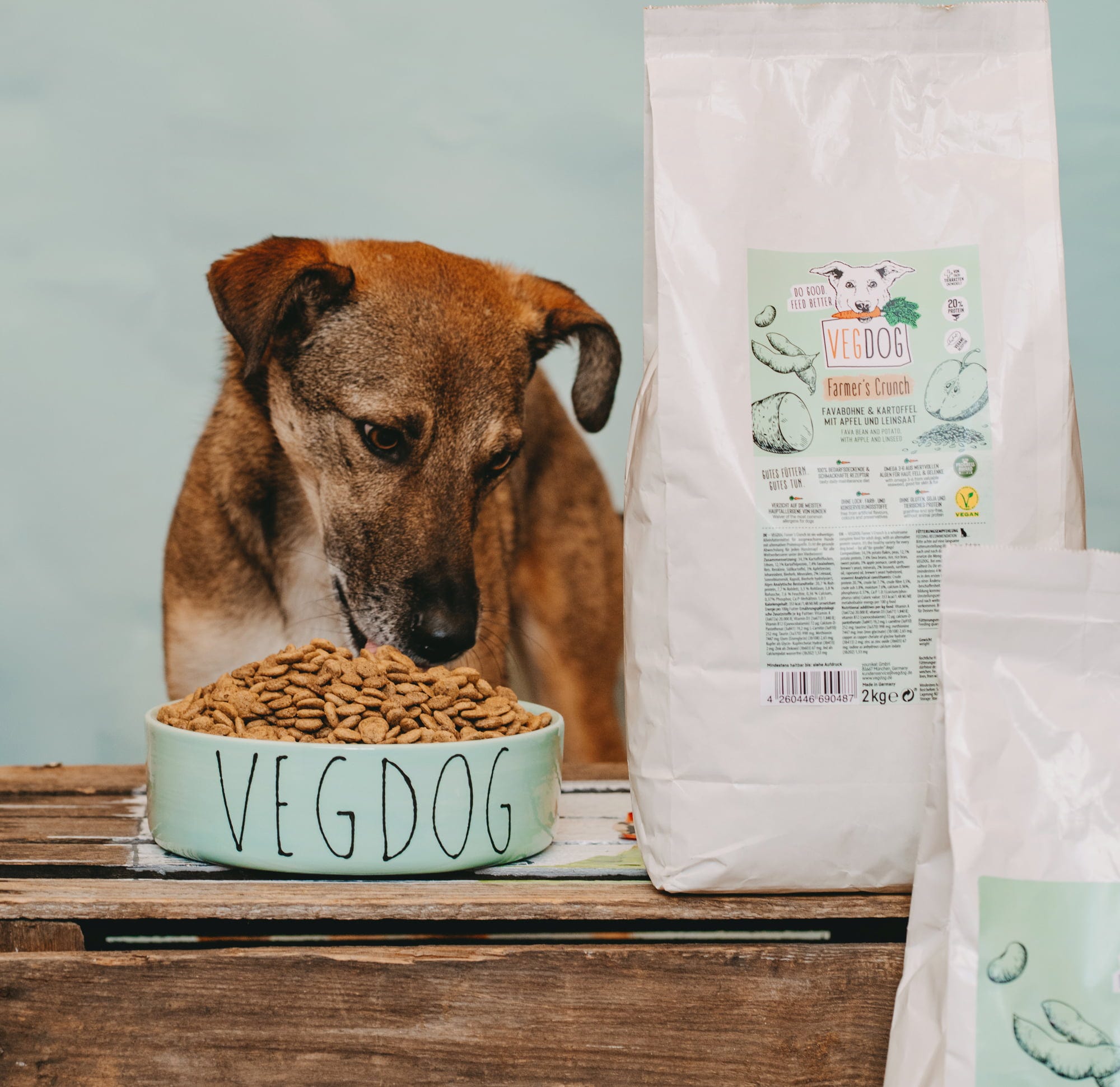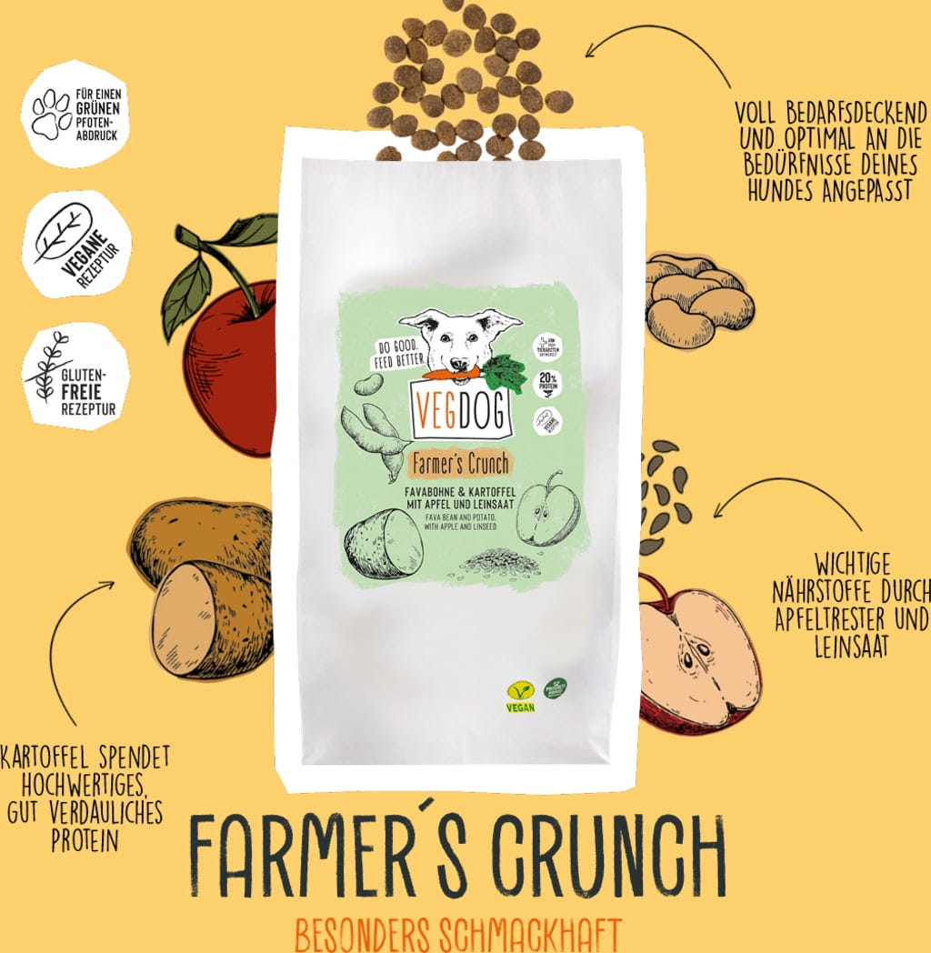 Farmer's Crunch od značky VEGDOG poskytuje plnohodnotné a vyvážené krmivo pre psov. Tieto vegánske granuly využívajú namiesto živočíšneho rastlinný zdroj bielkovín zo zemiakov a fava fazule. Hodnotná a zároveň chutná receptúra je obohatená o riasy bohaté na omega-3 a omega-6 mastné kyseliny, ľanové semená, jablká a špeciálnu minerálnu zmes VEGDOG.