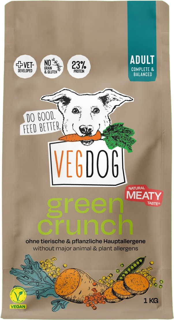 Green Crunch od značky VEGDOG poskytuje plnohodnotné a vyvážené krmivo pre psov. Tieto vegánske granuly využívajú namiesto živočíšneho zdroja bielkovín rastlinný zdroj zo šošovice a hrachu. Hodnotná a zároveň chutná receptúra je obohatená o riasy bohaté na omega-3 a omega-6 mastné kyseliny, sladké zemiaky, tekvicu, mrkvu, čučoriedky a špeciálnu minerálnu zmes VEGDOG.