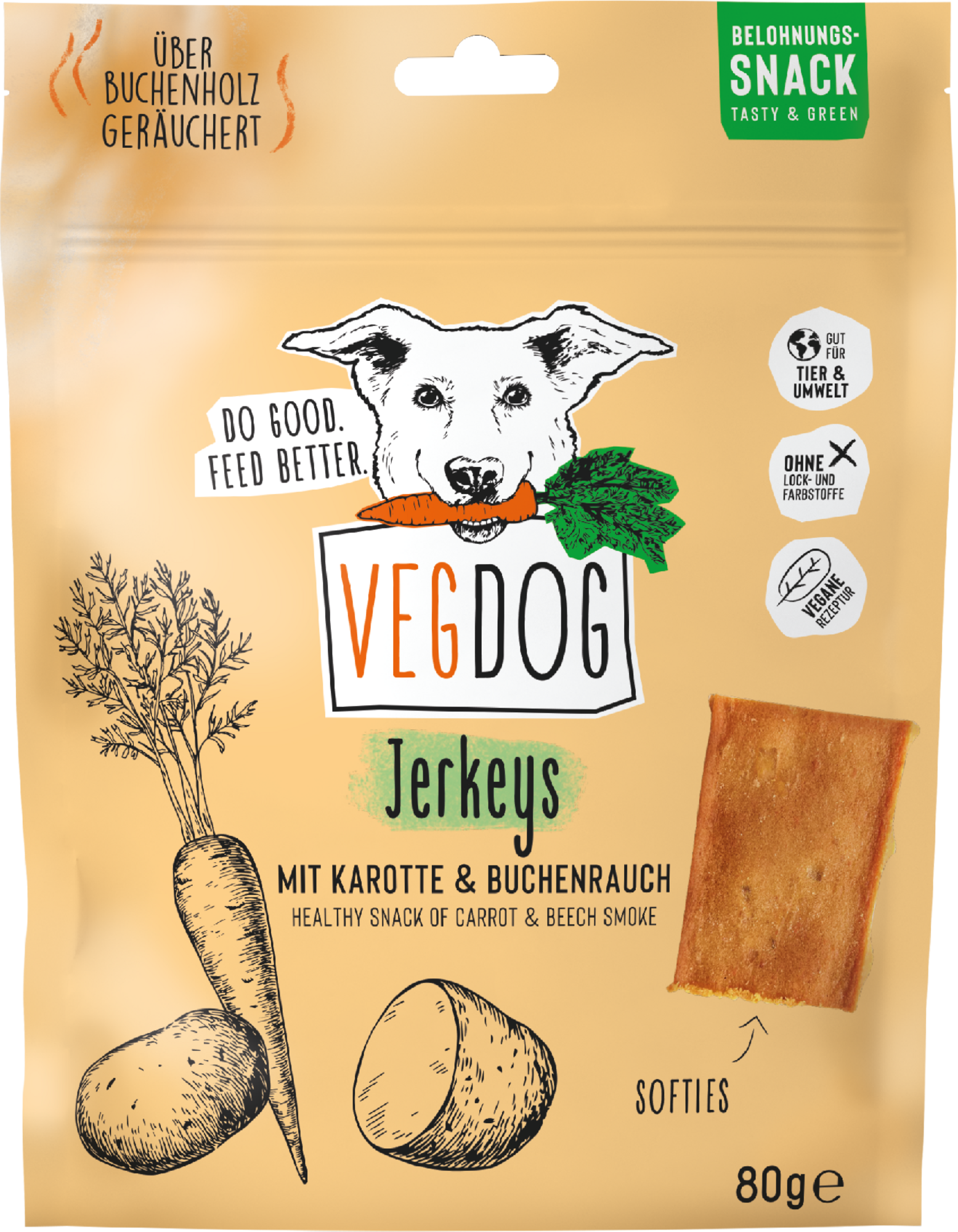 Maškrty nemusia nutne chutiť po mäse, aby boli chutné. Jerkeys od značky VEGDOG sú chutné vegánske maškrty s hypoalergénnou receptúrou, ktorá je vhodná pre psov s potravinovými alergiami. Korenistá aróma dymu z bukového dreva a chrumkavá mrkva robia z týchto rastlinných snackov výnimočný gurmánsky zážitok. Neodolateľná chuť, ľahko stráviteľné pre žalúdok.