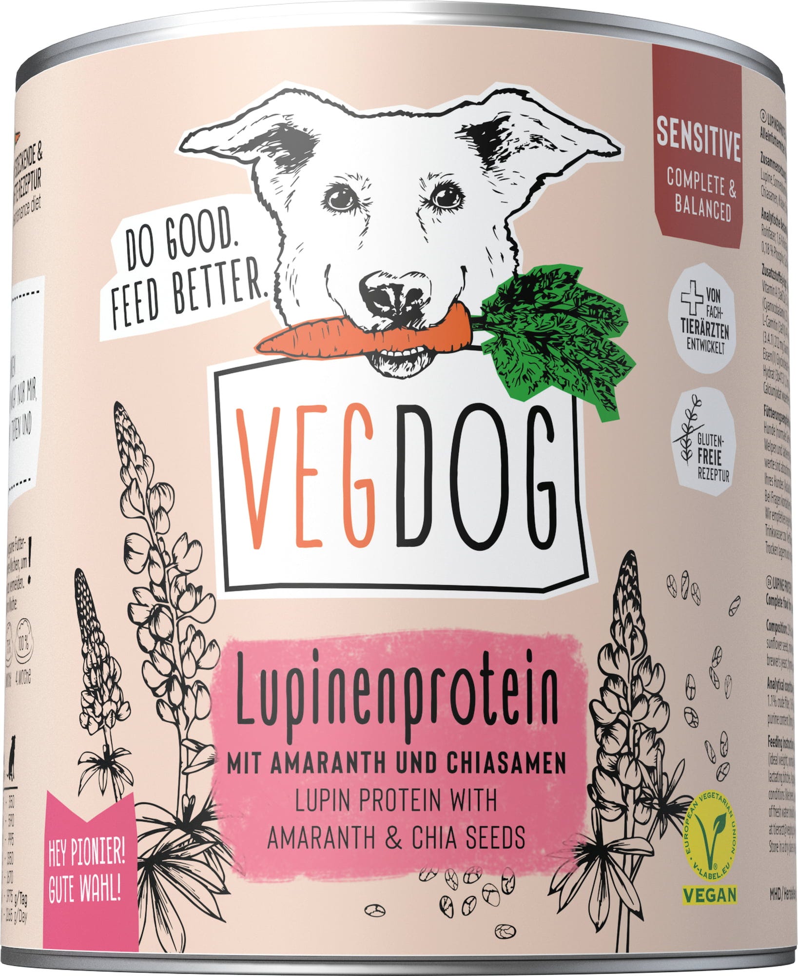 Mokré krmivo Sensitive od značky VEGDOG zoznamuje psov s novými, mimoriadne zaujímavými chuťami! Vegánska receptúra kombinuje sýte proteíny zo šošovice, lupiny a amarantu, pričom poskytuje dôležité živiny, ktoré psy potrebujú od prvého roku života. Do špeciálnej zmesi boli pridané riasy a chia semienka, aby bolo krmivo obohatené o esenciálne omega-3 a omega-6 mastné kyseliny. Špeciálny minerálny prášok vyvinutý značkou VEGDOG obsahuje dostatok vitamínu B12, taurínu a karnitínu. Bylinky ako púpava, medovka a rumanček navyše podporujú túto ľahkú receptúru.