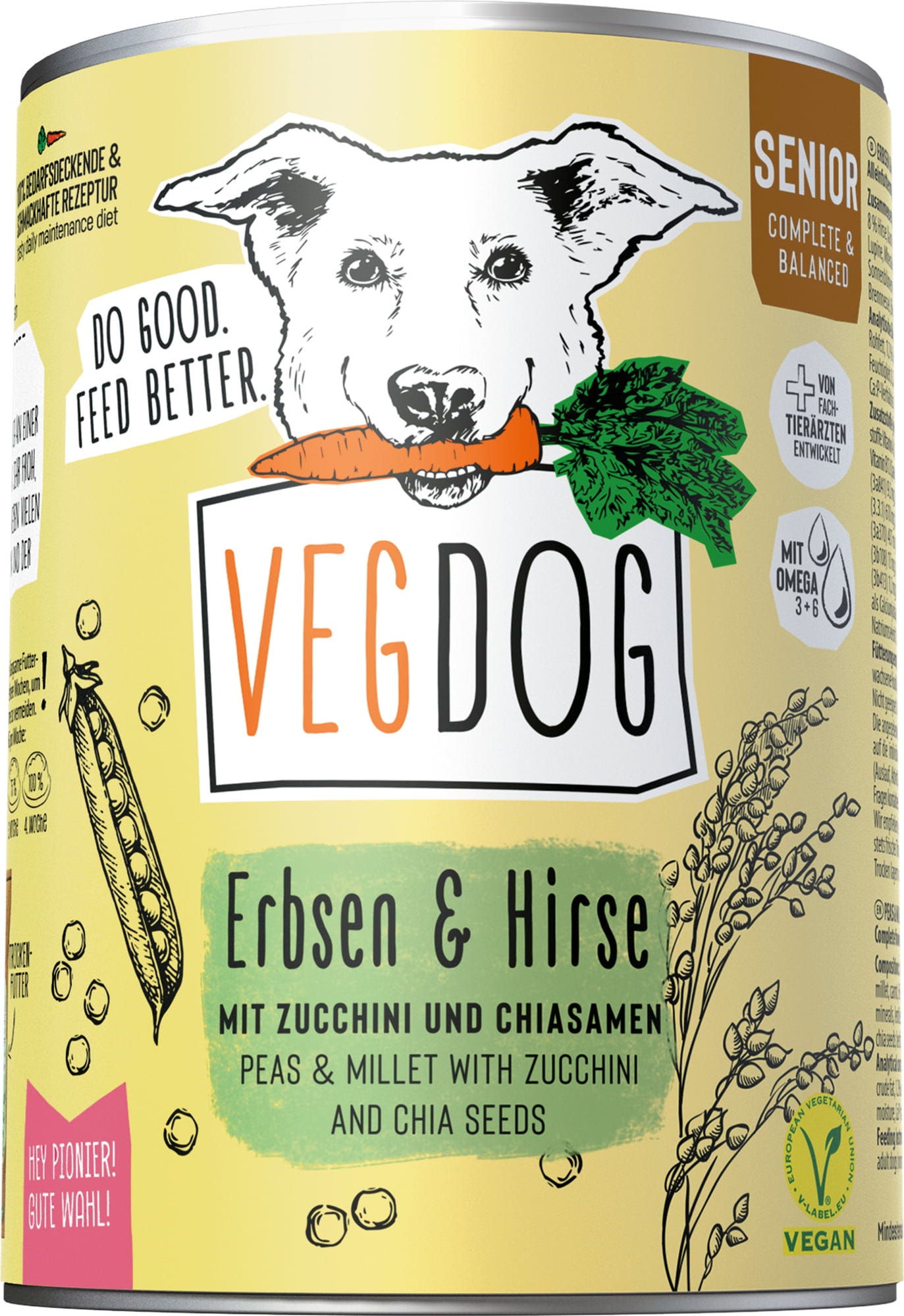 Senior krmivo od značky VEGDOG zoznamuje staršie psy s novými, mimoriadne zaujímavými chuťami. Vegánska receptúra kombinuje sýte proteíny z lupiny, šošovice a hrachu, pričom poskytuje dôležité živiny, optimálny pomer vápnika a fosforu a energetický obsah prispôsobený veku. Špeciálny minerálny prášok vyvinutý značkou VEGDOG obsahuje dostatok vitamínu B12, taurínu a karnitínu z hrachu, cukety a slnečnicových semienok. Chutné pšeno a chrumkavá mrkva obohacujú receptúru aj po chuťovej stránke.