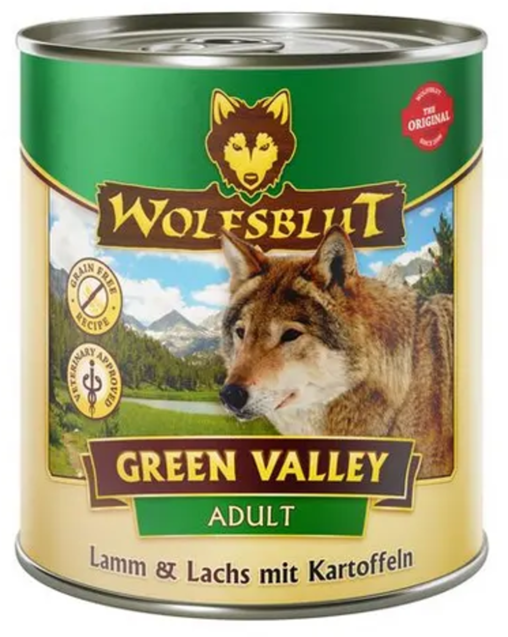 WOLFSBLUT Mokré krmivo s jahňacím mäsom, lososom a zemiakmi Green Valley Adult, 800 g